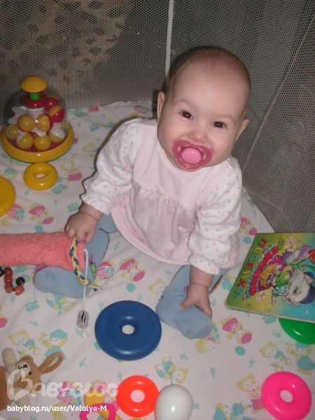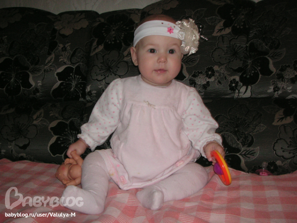 ХвастаемсяВот такие мы уже большущие!!! Как же быстро пробегает время! Этот месяц стал для нас месяцем переживаний и новых умелок. Мы почти две недели пролежали в больнице с бронхитом((( легли как только исполнилось полгода. Нашу попу искололи иголками и заставляли пить таблетки (это кстати о нашей медицине - в детском отделении нет сиропов от кашля, только таблетки...). Но в целом даже в больнице мы не унывали и постигали новые умения. Научились похорошему ползать и даже переползать через препятствия в виде подушек, подлокотников и пр. Научились сидеть, первый раз сама села ровно в полгода, а к 6,5 месяцам научилась это делать свободно, сейчас садится даже не задумываясь и сидит столько, сколько захочет, а не заваливается на бок как в первые попытки. Даже не научившись толком сидеть, дочка решила, что ей пора вставать, певые попытки (безуспешные, конечно) она совершила в больнице, цеплялясь за прутья кроватки (а глупая мама все думала, что она к ним лезет постоянно). Первый раз встать получилось, когда выписались в 6,5 месяцев, уже дома, дочка подобралась к подлокотнику дивана, оперлась на него ручками, встала на ножки и переместила руки на придвинутый к дивану стол, встав при этом в полный рост. Счастью ее не было предела, вообще она очень радовалась всем своим новым умелкам: получилось сесть - улыбка до ушей, встала - радостный визг, сейчас все это, конечно,не вызывает такую бурю эмоций. Теперь дочка встает, когда захочет, не могу сказать что совсем легко и свободно, но все же без особых проблем, встает на диване, держась за маму или папу, встает в манеже, в кроватке, около стула и т.д. Научились говорить первые слоги "ма-ма-ма" и "тя-тя-тя", иногда "да-да-да". Одевать дочку стало невозможно, она всегда удирает, особая беда перед прогулкой, когда памперс надо одеть! Купили дочке горшок, вчера "обновили", успели уже и посикать, и покакать туда (ну совсем как большая))) В питании появилась хоть небольшая, но все же разнообразность. Кроме маминой тити едим рисовую и гречневую кашу, кабачек, картошку, цветную капусту и брокколи, понемножку начали пить воду, иногда мне кажетсь правда, что не от жажды, а потому, что потом мама даст бутылочкой поиграть и можно будет соску покусать. Нравиться из кружки "пить" - в нее весело пузыри пускать, правда потом приходится переодеваться. Купаемся теперь сидя в ванной, научились хлопать по воде ладошками, любимая игрушка во время купания, это маленькое красное ведерко, почти не выпускаем его из рук. Ну и вес наш теперь 8900 гр, рост 71 см. Дальше фото-отчет: