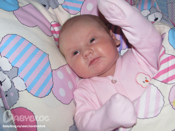 вот наш маленький отчетик: Алевтиночка поправилась на 1300г, выросла на 4 см, появились шеки и внушительная попка, когда родилась этого вовсе не было, смотрит телевизор, интересуется погремушками, очень любит по долгу лежать на пеленальном столе под яркой лампой, всех расматривает с удивлением, особенно тетю в очках)))) и вообще она так выросла за этот месяц и изменилась, смотрю на нее , уже совсем другой ребенок, большой)))) и кажется она уже все понимает, что я делаю, о чем говорю с ней.... но все равно копия папы)))))) фото под катом