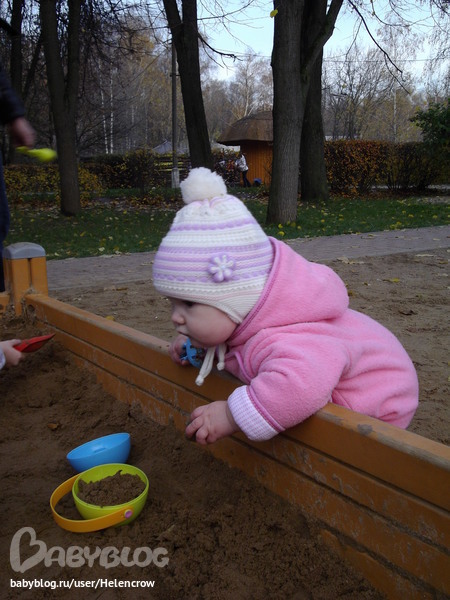 В этом месяце Марго добралась и до песочницы! Как же ей понравилось ковыряться в песке! Пришлось купить ведерочко с совочком, чтобы порадовать дочурку!)))