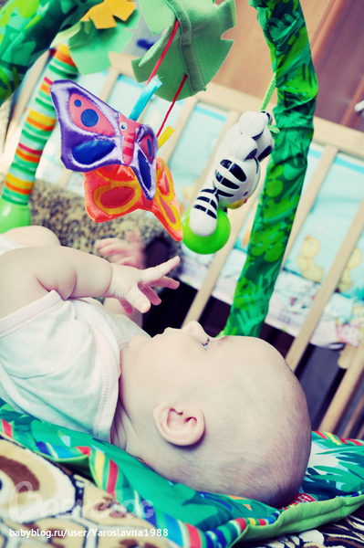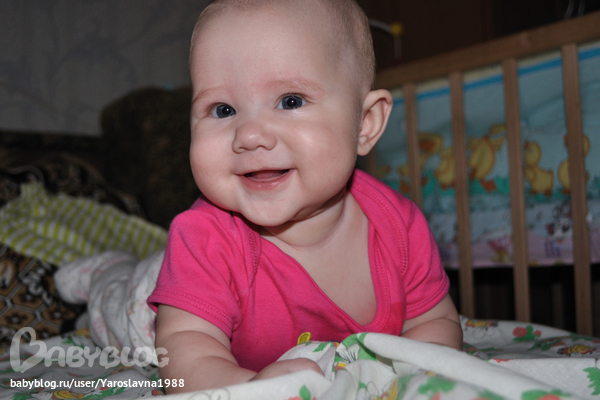 А так мы очень любим улыбаться, смеяться, когда я корчу разные рожицы перед зеркалом, хватать за нос и за губы маму и всех домочадцев))) хватает и тянется ко всем интересующим её предметам, ползёт по пластунски назад (чуть не свалилась с дивана один раз,вовремя я обернулась)