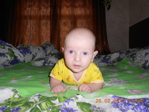 - в 5 месяцев пополз по пластунски, попробывал встать на четвереньки