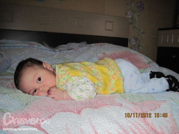 переворачиваемся на животик в 6 секунд, не успеешь голову отвернуть, а он уже на животе (ну очень любит на животе лежать).... держит игрушки, тянет их в рот, кулаки все время сосем, давала печеньку немножко сосал.....любит на ножках стоять когда его поставишь довольный, пищит от счастья.......уже большой, не хочет просто лежать на спинке......бывает лежит на спинке и голову поднимает, отрывает от дивана.....ручки даешь ему, он сразу сесть пытается.....