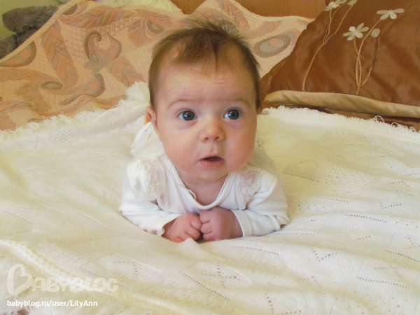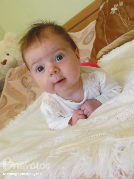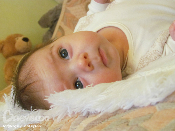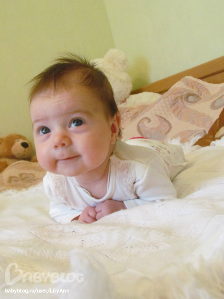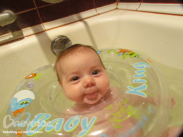 Наша Принцесса растет очень спокойной! Колики нас не беспокоили, слава Богу, капризничает только перед сном и когда надоедает лежать одной. Очень любит купаться с кругом! Во всю отталкивается ножками от дна и стенок)