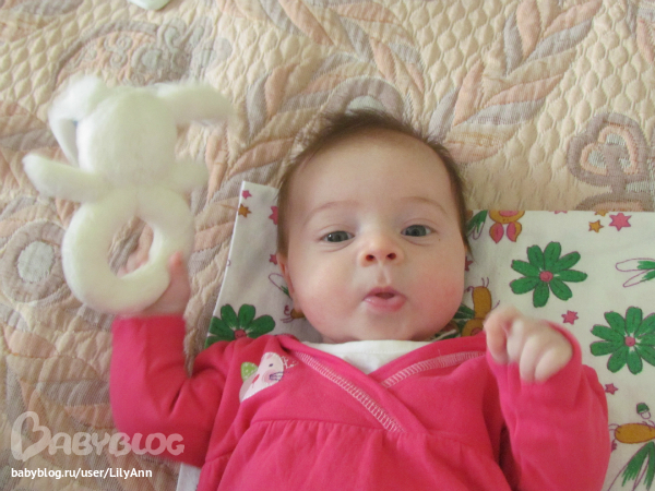 Очень любит грызть свои кулачки)))и посасывать свой язычок и нижнюю губу во время разглядывания игрушек на мобиле и развивающем коврике, которые, кстати, тоже любит) Анюте нравится гулять и летать на руках, при чем, не останавливаться при этом :) Еще мы с ней читаем и разглядываем детские книжечки со стишками про животных) а вечерами я читаю ей детские рассказы или книжку на английском языке (в силу своей профессии)совмещаю приятное с полезным, и самой не забывать язык, и Анюту развивать))) во время моего чтения не капризничает, слушает внимательно, наблюдает как я перелистываю странички)