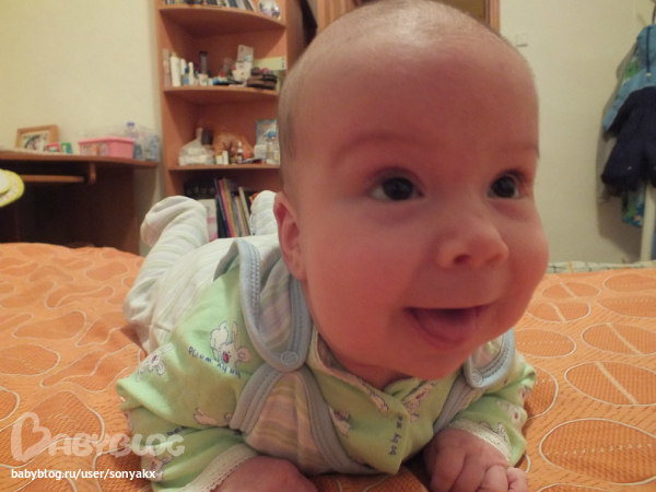 Очень любит разговаривать, играть с погремушками, с подвесными игрушками, все игрушки трогает, щупает, хватает, когда лежит у меня на руках стал ручкой тянуться чтоб мое лицо потрогать, волосы погладить) со спины на живот поворачиваться не хочет пока, не пытается даже, а вот с живота на спину почти переворачивается уже сам)