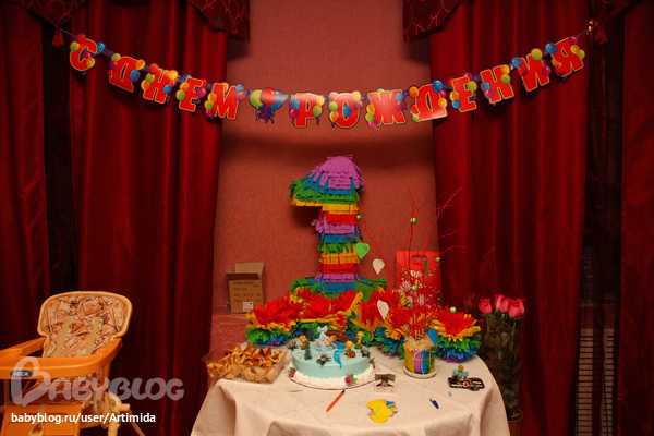 Ну и зал конечно украсила. Над столами букеты шаров; бумажные помпоны делала-делала, повесить не успела, так и лежали на столе, рядом с единицей; стойки из шаров. Вроде все. А, еще сделала усы на палочках, для фото. Хотела еще видеоролик сделать, но в зале не на чем показывать было. Так все и прошло.