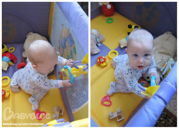 В первый раз в манеже, держась за свисающую игрушку. Я прифигела немного, но успела сфоткать, правда ракурс не очень удачный взяла.