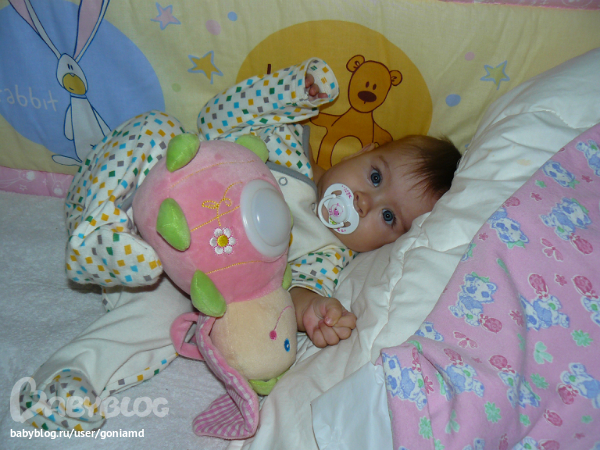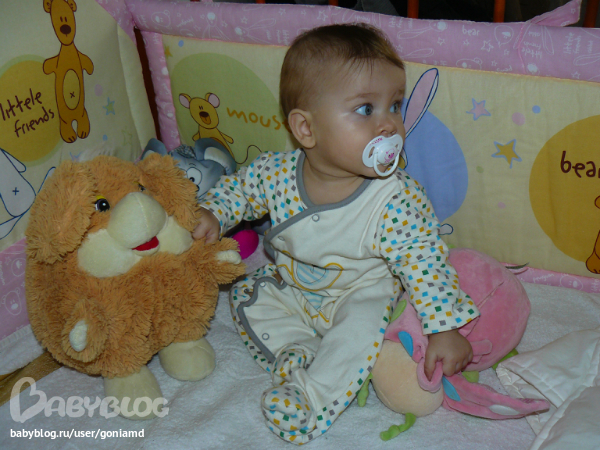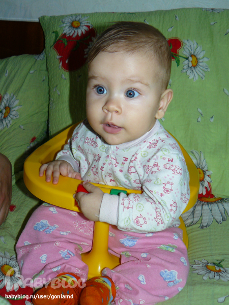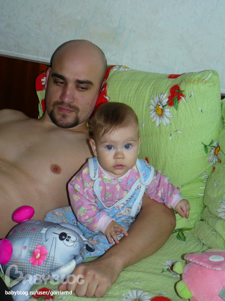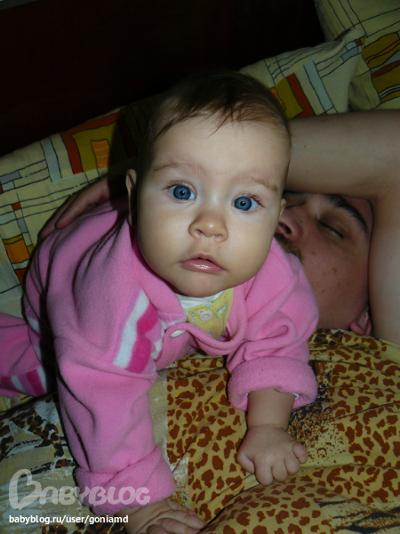 Недоношенные малышиРастём,растём,растём!В последний месяц режим полетел наш в тар-тарары))думаю из за зубов...один нижний уже торчит,ждём второй...он уже на подходе!Капризулька стала жуууть,целыми днями хочет только на ручках быть!А у меня куча дел не деланых и ни чего не успеваю!Наконец села моя Милочка,ползаем на животе...есть попытки встать на четвереньки,но пока это просто попытки..Очень много болтает,иногда как заведётся,на всю квартиру слышно её бабаба,мамама,папапа,дядядя,вавава.Любит когда читаю и картинки показываю!!Кушаем в основном сисю,кашки ингда(не любит их),овощи любит,цветную капусту,брокколи,печеньку детскую даю иногда,сушки,чаёк детский.Спит в кроватке,но она стоит впритык к нашей,наклоняюсь ночью к ней,кормлю и спим дальше,днём конечно спит плоховато,зато ночью даёт всем выспаться!Пишу кртко,т.к не даёт нормально собраться и нормально написать))ну и фото!!!
