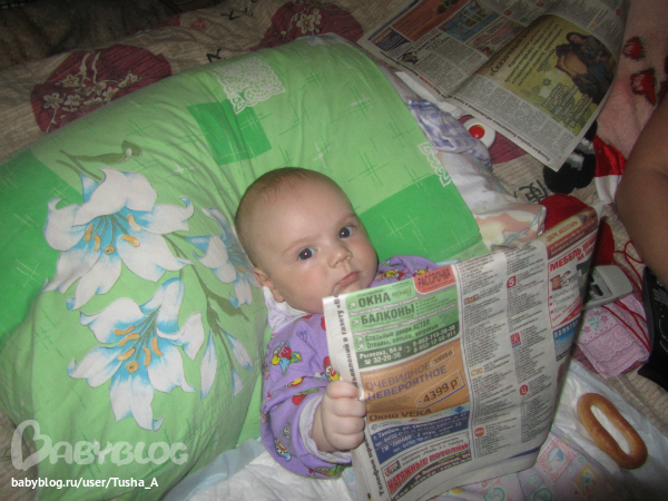 Перевороты делает с животика на спину только, а со спины на живот не может, максимум на бок, а дальше никак. Смеется в голос очень часто, стал очень улыбчивый, хмурость сошла. Узнает всех вокруг и даже врачам улыбается. Научился ладошки ставить сзади себя и из положения полулежа садится, пыжится аж кроаснеет. Раньше не поощрла,все говорили рано, но он подтягивается уже буквально за все.. Даже когда в коляске лежит за бортики руками хватается и тянется. Научился ко мне ручки тянуть, когда кто-то другой на руках держит. Барахтается на животике, понемного отползает назад, ноги научился трогать. Когда лежит на спине, попу поднимает, как бы пробует на мостик становиться)Так много всего уже умеет!! Песни петь так и продолжает буа-гу, аа, ага, ага, угу и много мн7ого разных других слогов)) Читаем сказки, поем песни, гуляем- это все по старому. Купаемся по прежнему в кругу, волны пускает ну просто морские!
