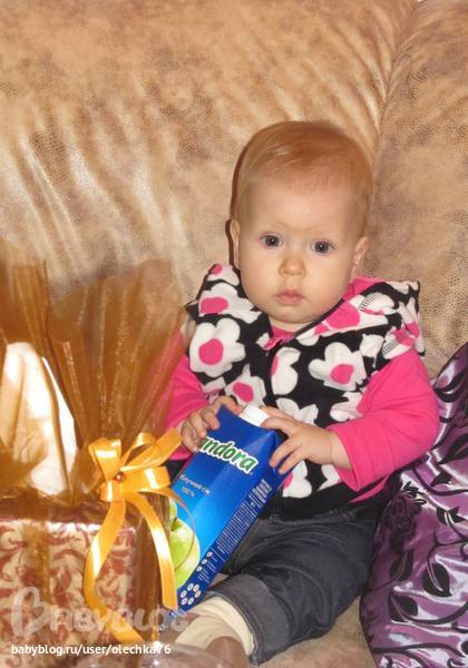 Итак, имеем мы уже 6 зубов, шестой вышел как раз 5 января. Много лопочет на своем языке, четко выделить можно ма-ма-ма и ДА (при этом кивает головой). Стала играть кубиками, ей они только сейчас понравились. Требует, чтобы играли вместе с ней. Стоим сами, только если к чему-то прислониться. За ручки топает вовсю. Нового в еде не вводили. У нас появилась сыпь, долго искали на что, постепенно исключали продукты, пока не выяснили, что сыпит на сухари и сушку. Как их убрали, все наладилось, а жаль ей так нравилось грызть сухарики. Да и со всем этим в весе не набрала ничего. Подарок пришел как раз 4 января ей. Я осваиваю интернет-покупки в Америке, вот одежки из Картерса доехали.
