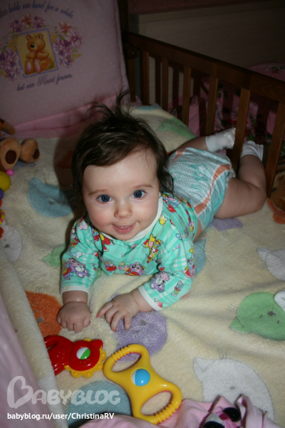 - Переворачиваемся на живот со скоростью света))) Положу ее на спину, отхожу, поворачиваюсь, а она уже на животе))) Умеет вертется на животе вокруг себя. Уже одну на диване ее не оставляю даже на середине, уже может сползти с него))) Шустрая девочка!)))