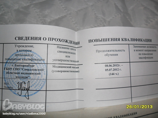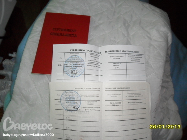 МассажПопробую подсказать из накопленного опыта как можно отличить настоящего специалиста .Сначала главные моменты.потом мелочи . 1.) Просите документы (это свидетельство об окончании специализации по детскому массажу и лечебной гимнастике ).Ключевое слово -Медицинский массаж ,печати департамента ЗДРАВООХРАНЕНИЯ, а не непонятной конторы .Если вы пригласили специалиста ,работающего в поликлинике или стационаре ,анализы он сдаёт по месту работы ,там же выполняется флюорография ,что является необходимым условием для работы с детьми и Роспотребнадзор за этим следит тщательно .Если массажист работает частно ,трудовая дома ,то пусть покажет санитарную книжку .Вы имеете право посмотреть на них .Если массажист отказывается ,лучше поищите другого .Дипломы и сертификаты всегда дома,трудовая-на работе . 2.) Не отдавайте деньги вперёд никогда .