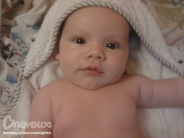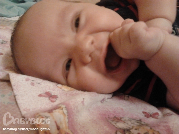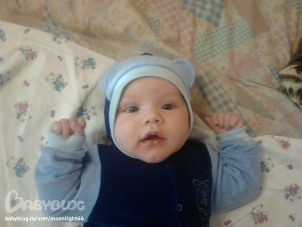 Итак на уже 4,5 месяца. Мы уже самостоятельно переворачиваемся на живот,ругается когда не даю вертеться))) Пытаемся ползти,пока все неуверенно,но старается очень тщательно)Пытаемся садиться) Требует чтоб посадили - очень ему нравиться) На днях нашли ножки.теперь, после сна особенно, проверяем не украл ли кто))) Едим все так же только грудь.Пробовала вводить сок,но у нас выскочил прыщик - забила на эту тему до 6 месяцев))) Сосем баранки))очень нам прямо нравиться))) Гулит по полной. Бывает лежит или сидит на руках и что-то очень увлеченно расказывает,доказывает)) В последние 2 дня новый прикол у сынули - он визжит,именно визжит а не плачет) так весело смотриться)))