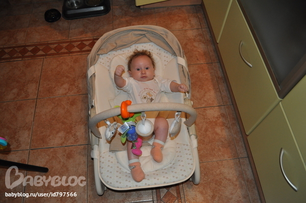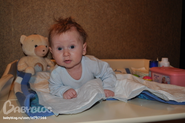 Переворачиваемся так же с живота на спину, но скорость переворачивания оооочень увеличилась. Пытается выпрямлять ручки и поднимает попу. Интересно, когда поползет?