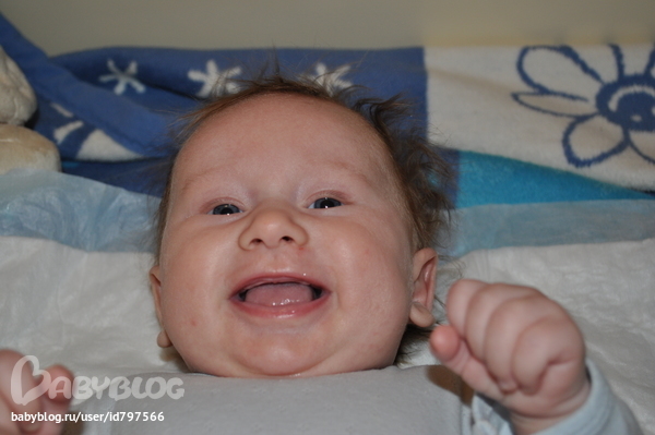 Недели 2 назад как начал гулить!!! До этого молчал почти, бывало, что разговаривал, но как-то неохотно. Сейчас - почти всегда. Говорит со мной, мужем, игрушками, кошкой)) Почти все звуки сопровождаются слюнями во все стороны.