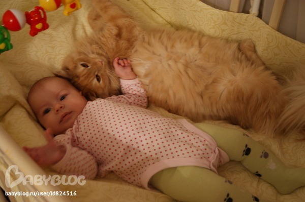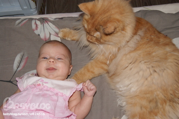 Ребенок и животныеКогда была беременна очень переживала, как наш кот Шумахер отнесется к новому члену семьи - дочурке Анечке... Приехав из роддома положили крошку в кровать, а кот с интересом пытался выяснить кто там, пытался заглянуть в кроватку, становясь на задние лапки, как зайчик (очень смешное зрелище). Нашей дочке уже почти 5 месяцев, так получилось, что кот приходит к не спать каждую ночь, а когда она видит его - визжит от радости, машет руками)), а сейчас уже пытается ползти к нему! Посмотрим, что будет дальше!