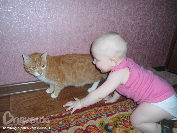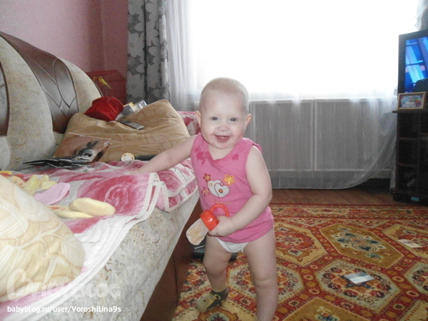 Умеем ругаться,драться,возмущаться. Кушаем кашки всякие,супы из мяса,пюрешки,пьём соки,морсы,чай,водичку. Наш вес 8800кг. и рост 71см. Надеюсь скоро сама пойдёт!))) Я так люблю свою кисоньку!!!))) А что умеют ваши детки в таком возрасте? Очень интересно!)))