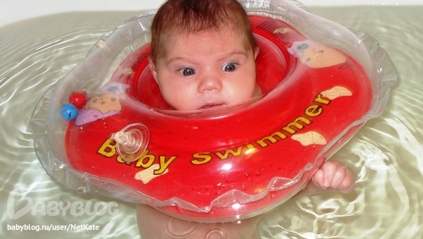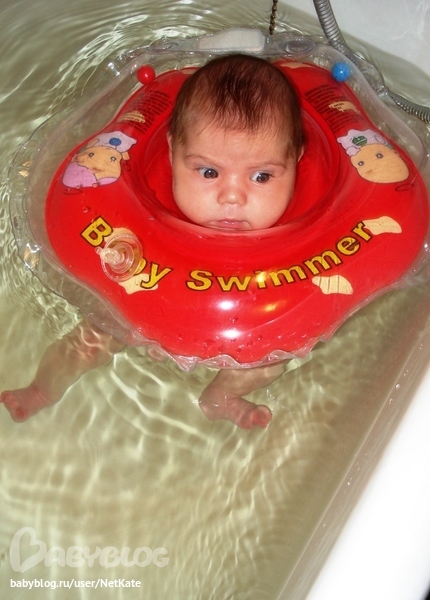)))Нашего вчера первый раз тоже с бейби свимером купали)))лицо у него было очень похоже на лицо вашей дочурки)))а еще так смешно...такое ощущение,что этот круг только за счет щек и держится