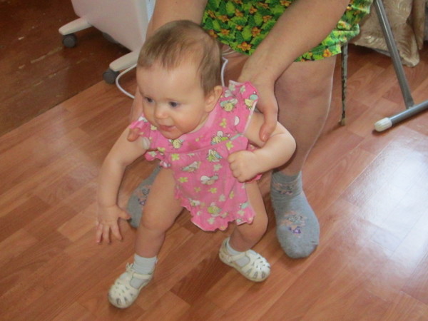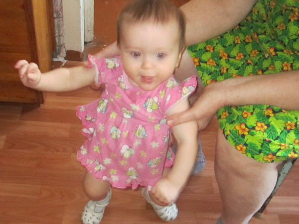 Потом надела на ножку, было ей интересно рассматривать, что же это такое на ней необычное))) А когда поставила дочу, начала топать ножкой, подпрыгивать и смеяться. На фото бабушка держит, чтоб не убежала))) Пока водили тоже останавливалась и топала)))) Очень они ей понравились, ну что ж будем пока немного учиться в них ходить, чтоб к лету уже бегать во всю))))
