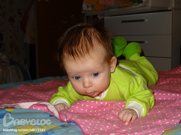 Я ее положила на животик и она так выгнулась поднилась на ручки уперлась и бух перевернулась на спинку и смееться лежит так ей понравилось))))