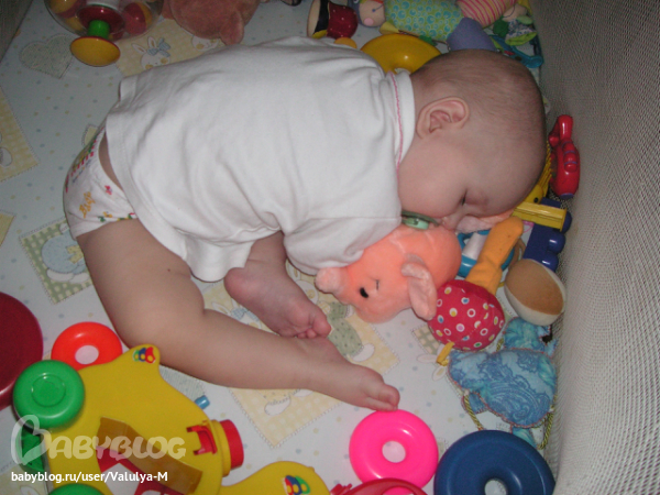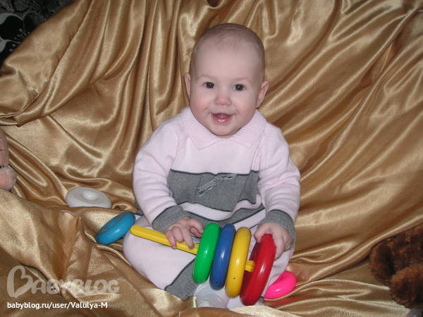 Много весело и забавно играем. Теперь в ход пошли и ладушки, и "нам не нужен барабан, мы на пузе поиграм" (хлопаем себя по животику), хлопаем себя по грудке со звуком а-а-а, сорока-ворона тоже вызывает интерес, "читаем" книжки, раскидываем пирамидку, разбираем матрешку и конструктор, иногда пытаемся и обратно сцепить детальки, даже иногда получается, правда пока только с матрешкой, любим мячик и воздушные шарики. У дочки ужасная страсть к картону и бумажкам, ест их как будто это шоколад, поэтому все книжки упаковались в скотч))) Еще мы называем ее маленьким "пылесосом" и "санитарным контролем" за страсть собирать соринки самые мелкие))) Вообще хватаем предметы не только всей ручкой, а берем двумя пальчиками, если это что-то мелкое, выглядит очень забавно, этакий маленький ристократ))) Делимся с мамой и папой всем, чем играем и что едим - протягиваем руку и ждем пока мама игрушку "попробует". Любим смотреться в зеркало. Еще очень порадовало меня наша умелка, дочка научилась свистеть в свистульку