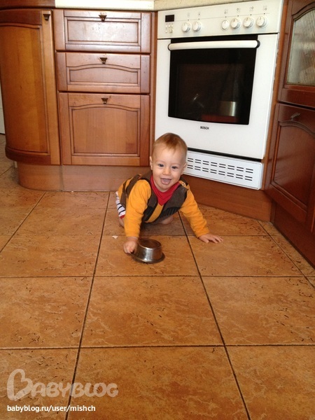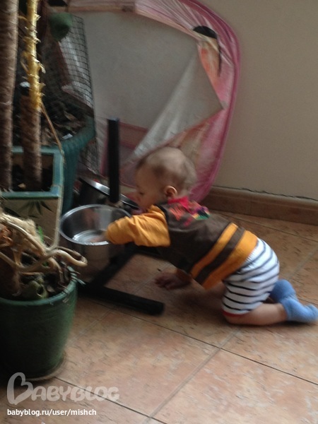 Еще Тоха питает страсть к собачьим мискам, очень любит в них ручкой водичку щупать, ну про горшки с цветами ваще молчу, у мамы моей целый сад, но не цветочков, а огромных фикусов, ростом под потолок, всяких разных - Тоша обожает ручкой в земле по ковыряться, вытащить уголек и по пробовать его на зуб - Ну вот не всегда я успеваю за ним уследить!