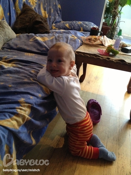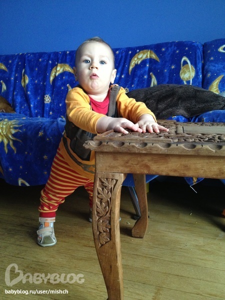 К Новому Году Тошка подарил нам первый зуб и встал - теперь он больно кусается уже двумя зубами, а я даже ем теперь стоя, т.к. все время бегаю за Тохой и либо кладу стоящего в горизонталь, чтоб не упал, либо отбираю у хищной и хитрой ручки то, что эта ручка с кофейного столика в гостиной утянула, либо перехватываю его на пути к не дозволенным местам, таким как коридор с уличной обувью, вообще Антоха отличается завидной Упертостью, с большой буквы У, т.к. на пример от домашних тапочек со словами "Тошенька нет нет - это есть нельзя" - я его оттаскиваю по сто раз за день, причем я еще не успеваю разогнуться после того как положила его в его игровую зону, а он уже на всех парах к тапкам назад несется, в общем целый день делаю полезное упражнение "Наклоны с весом"!)))))))