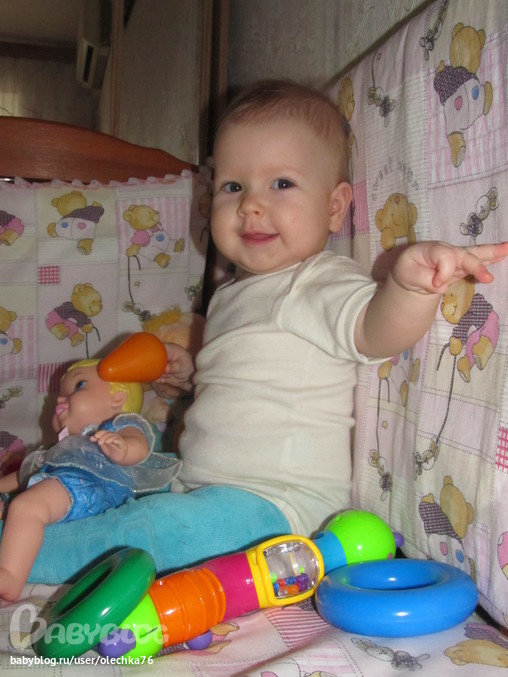 Главным развлечением теперь у нас стало ходить. Топаем по всей квартире за ручки или обматываю шарфом и тогда у нее ручки свободные и ко всему тянутся. Есть у нас такой "любопытный пальчик", которым она все-все исследует, включая еду.