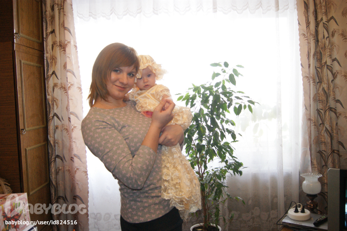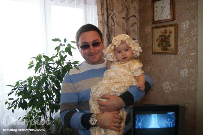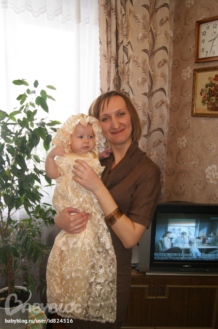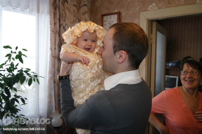 На таинстве она совсем не плакала, а даже наоборот была в прекрасном расположении духа - всем улыбалась))) Она даже священника улыбнула: он подошел к ней - молитву читает,а она на него смотрит таким пронзительным, изучающим взглядом и вдруг улыбнулась ему, а когда она так делает сложно не улыбнуться в ответ, вот и священник не устоял и сквозь молитву проскользнула его улыбка))) Вобщем на самом крещении было сложно сдерживать улыбки всем, так как Аню это явно забавляло, но мы старались, ведь это серьезная церемония! Все прошло как нельзя лучше и Анечка под конец заснула на руках у крестной, это было так мило... Фото от фотографа еще не готовы, я вам их позже покажу, а те которые сами дома нафоткали можете посмотреть под катом...