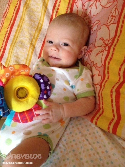 В последнее время Алеша снова полюбил мобиль, больше всего ему нравится зебра. Именно ей он улыбается и уже видно, что хочет схватить, но пока только ударяет слегка. Вообще улыбок море, и мне и всем родственникам и друзьям.