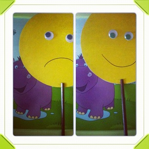 На одной стороне – грустный смайлик, на другой – веселый. Поворачиваю веселым смайликом к малышке и начинаю сама улыбаться, приговаривая: «Улыбка! Человечек улыбается, мама улыбается, Ниса улыбается!» И деть действительно начинает улыбаться. Поворачиваю другой стороной и уже без улыбки говорю: «А теперь человечек грустит» И у малышки с губок улыбка сходит. Вообще удивительно, как она в эти моменты реагирует.