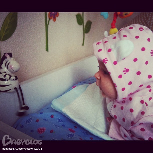 Игрушка на пеленальном столике. Тоже где-то прочитала, что хорошо бы обзавестись такой на пеленальном столике, чтобы ребенок, лежа на животике, мог что-нибудь детально рассматривать. Я «поселила» туда зебру, так как интерес ребенка к черно-белому и контрастному до сих пор высок. Так вот даже когда я перекладываю девочку на спинку, она все равно крутит головой, чтобы найти свою полосатую подружку, а с недавних пор стала тянуть к ней ручку.