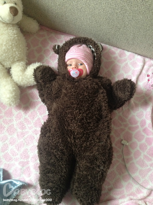 У нас почти такой же комбез, тоже мишкой?А сколько у вас градусов?..просто на весну его брала...теперь думаю при скольки надевать уже можно будет..пока в зимнем конверте ношу.