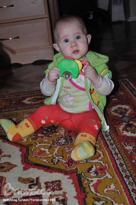 Ходим за ручки по квартире, открываем все ящики, и достаём содержимое, разбрасываем по полу и ползём к другим ящикам))) Весь день повторяем мамама папапапа бабабаба......, когда я прошу показать где динь-динь ( колокольчик), поворачивается в его сторону, и так же на ещё некоторые предметы в доме))