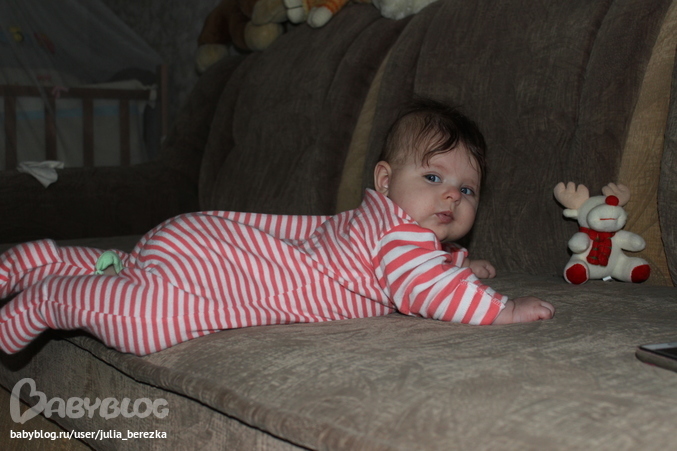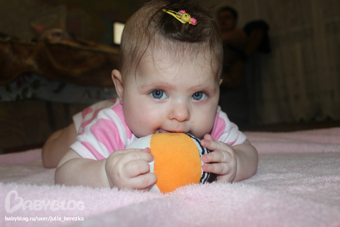 И все срузу тянет в рот! поэтому все игрушки мокрые и слюнявые) Нашла свои ножки, лежит их голяком и трогает. смешнючка малая) Перворачивается на живот, обратно пока никак. хотя в воде крутится юлой. Лежа на животе поднимает попку и пытается стать на коленочки. Может скоро поползем