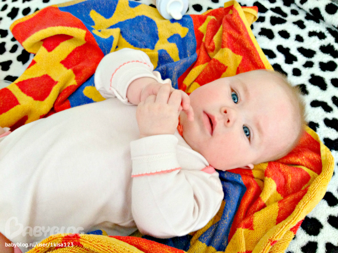 и днем спим реже,уже сон не такой глубокий . Если себя тихо вести не будешь, то обязательно проснется доченька. Спит днем 2 раза по 2-3 часа в среднем. Купаться так же любим, но одеваться не любим.
