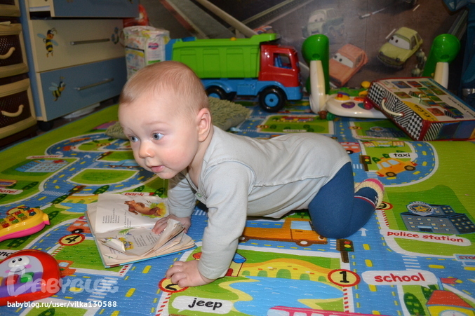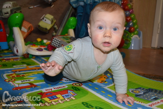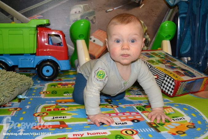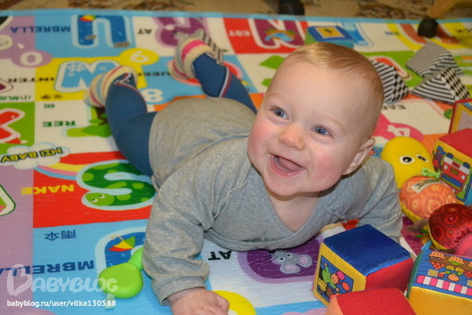Месяца в четыре Елисей уже активно играл лежа на животе вытягивая ручки,но все детишки разные и все умелки индивидуальны.Мой братик вообще не ползал,а в 10 месяцев встал и пошел.Елисей у нас очень подвижный малыш.На месте не сидит,не ленится-постоянно в движении)))На коврике с трех месяцев.Я им очень давольна!!!!!Заказывала у Алены на ББ в Совместных закупках)))
