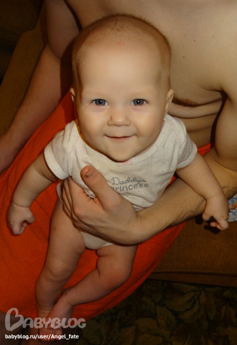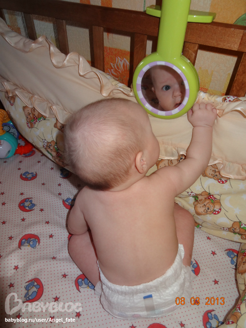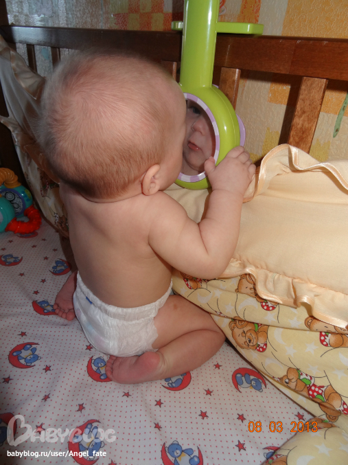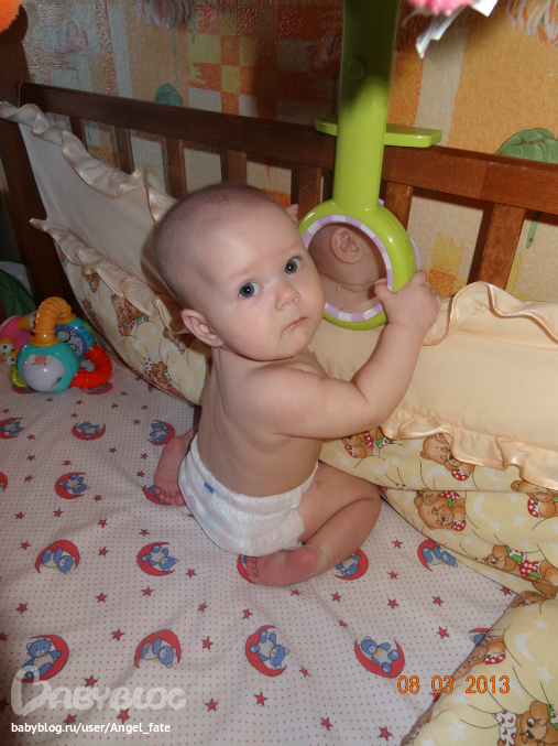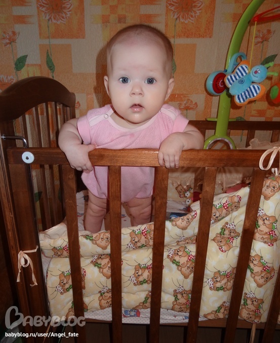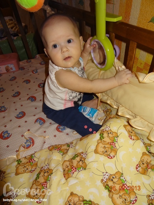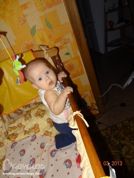 8) Чуть не забыла, мы ходим с поддержкой.. и когда сама в кроватке стоит,то начинает ходить, одной рукой держась за бортик)) Включает сама музыку на мобиле и делает кабзец его игрушкам))