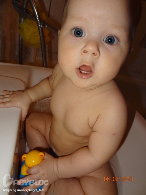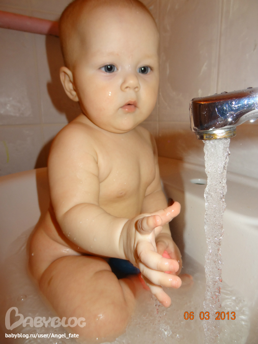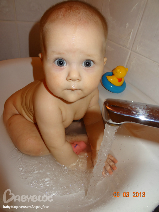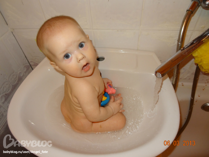 10) В ванной комнате: купаемся днем в раковине, (это перед подмыванием) а на ночь в ванне иногда со мной, иногда с папой, иногда одна))) Все пытается струю воды схватить, не получается и начинает психовать, смешная)) (у нас ремонт, на кафель не обращайте внимание..я уже привыкла..закрывать глаза((