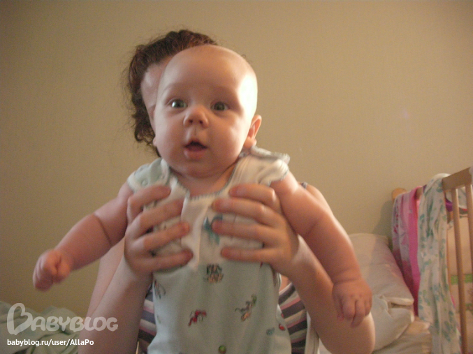 А вот это уже кое-что: берем игрушки - погремушки, сидим у мамы/папы на ручках, когда ставим на ножки - пытается стоять :) в манеже когда лежит, держится за пеленку ручками и пытается подняться - выглядит так смешно и очень мило