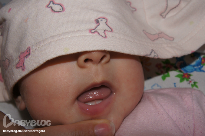 Стала капризная и плаксивая очень, уже дней десять. С рук спустить вообще невозможно. Слюни до пупа, ручки по локоть во рту, и плач внезапный, казалось бы без причины. Грудь стала плохо брать. Взяла, пару раз соснула и отпускает с плачем. Но все же сосет, спустя несколько таких попыток. Уже собиралась вещи в психушку паковать... А вчера заглянула в ротик, и вот что увидела... Для зубов как бы рановато еще, да и крупные больно... Ротик чистый - молчница исключена