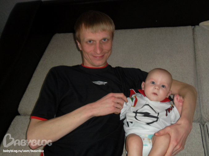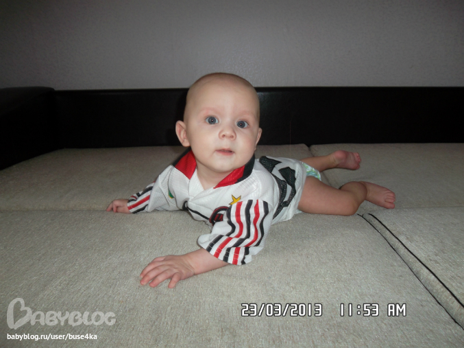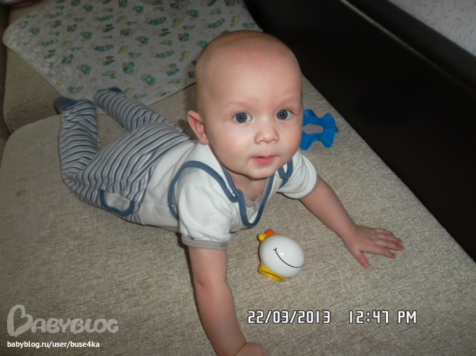 Мы очень много чего умеем и имеем два зуба!!!!!!!!!! Маратик очень непоседливый,все ему надо.Если что-то не получается достать-устраивает скандал! Марат ползает.Иногда у его это очень хорошо получается,но потом он словно забывает и ползет по-пластунски)))Ничего,это временно,тем более,что на четвереньках стоит! А вот позавчера он стал проделывать такое упражнение:становится на четвререньки,а потом перебирает ножками,пока не станет в позу страуса! Очень смешно это выглядит,жаль,но не получается пока сфоткать своего маленького страусенка!Обожает папу!!!!!!!Как только видит его,сразу начинает вырываться и проситься к нему на руки!У Димки сидит на руках спокойно,не то что у меня! И вообще,когда муж дома,Марата не узнать! Так хочет папе понравиться! Кушает Марат уже много чего.Каши:овсяную,гречневую,кукурузную давала,но она у нас не прижилась,овсяную с яблоком и абрикосом.Из овощей очень любит кабачок,ест картофельное пюре,запивает смесью.Из фруктов обожает банан,чернослив,яблоко.Режим у нас сейчас зависит от погоды.Если солнышко,то тогда ходим на улицу по два раза и на большее время,соответственно и спим больше.А так наш сон днем по 40минут,хоть часы сверяй.Отбой в 21 00,подъем в 6 утра,пьем смесь,потом досыпаем до 8,в 9 уже едим кашу. Вот так вот.Ну,и по традиции пару фото: