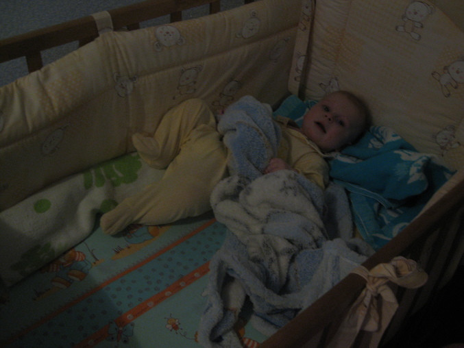 первый раз уполз)) слышу-тишинаааа.. ну, думаю, спит.. ан нет-уполз в ноги, перевернулся, развалился и телек смотрит, деловой))