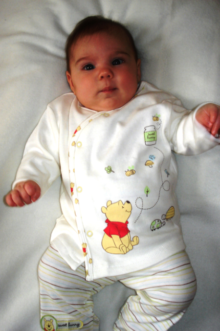 В пол-ку пойдем позже, там взвесимся и измеримся. Во вторник будем делать Пентаксим. Фоткались вот только что, Еуня была уже сонная) Костюмчик на 3-6 мес. подарили, пока еще большеват) (еще фотки под катом)