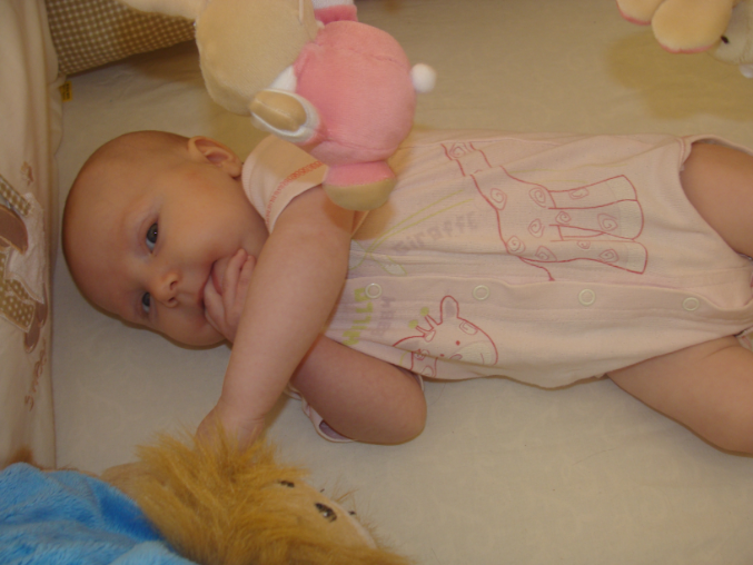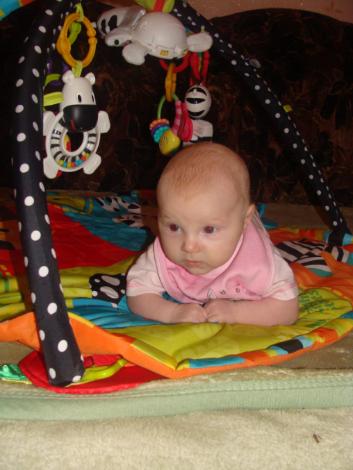 Что мы умеем?) Начнем по возрастающей) Само собой держать голову, стабильно с 2 - х месяцев, полностью без поддержки! Аукать, укать, акать! Улыбается беспрестанно, наблюдадет за передвигающимися людьми и предметами, вступает в диалог с родственниками! за 4 дня до 3 месяцев перевернулась с живота на спину, поджав под себя ноги. На живот со спины перевернулась в 3 месяца и 5 дней. Довольно рано! Сейчас нужен глаз да глаз, потому что крутится во все стороны только так) Если нет места для переворотов, например, когда лежит в кроватке, крутится вокруг свой оси!)) Конечно, сосем пальчики и все, что попадается на глаза. Старается засунуть в рот ноги, но пока попытки тщетны, один раз лизнула большой палец на ноге, но больше не получается. Вообще, ноги - это сейчас очень важная игрушка в ее жизни, много внимания достается именно ногам! Слава Богу полюбили купание, заобожали можно сказать, плюхается с превеликой радостью, папа выходит с ног до головы мокрый!