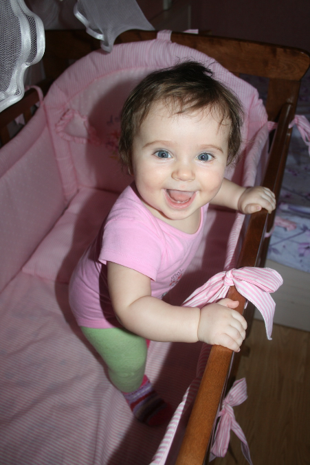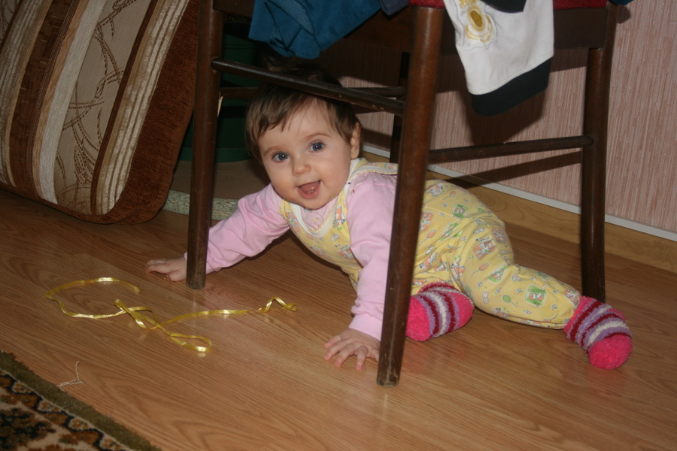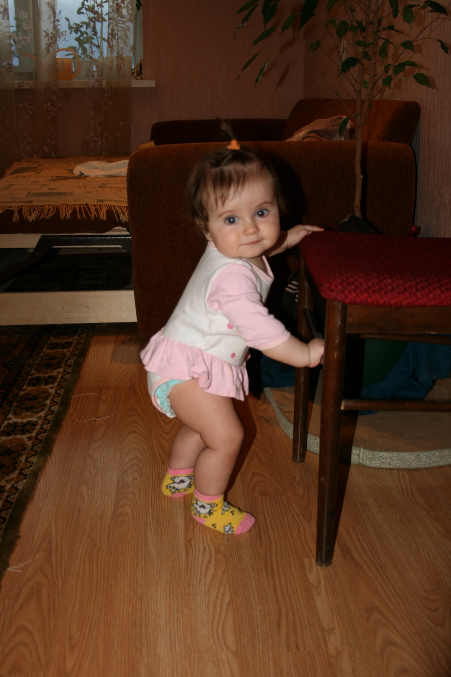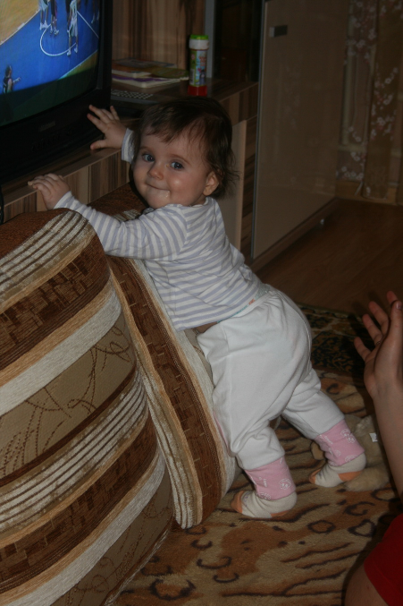 Ой, этот месяц прям переломный у нас)) Научилась ползать, теперь все крушит на своем пути))) бегаю за ней по пятам и строю барикады у всяких шкафов и цветков, и прочих куда нельзя)) научилась вставать у опоры, встает везде, где можно ухватиться)) Стоит еще неуверенно, поэтому часто падает, но с каждым днем стоит все увереннее. Может ходить вдоль дивана или стены неспеша. Недавно научилась не падать когда стоит, а садиться потихонечку. Еще можем с ней немножко ходить за ручки!