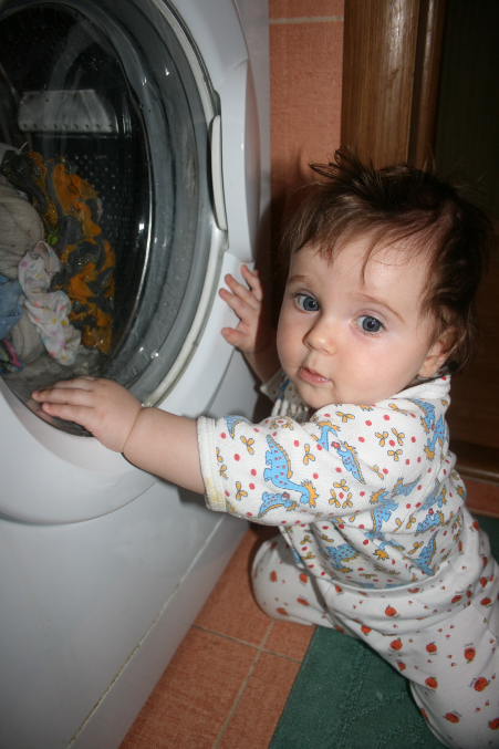 Вообще растет она еще той шкодиной)) Недавно я стою мою посуду, она ползала на полу в зале, оборачиваюсь, нет ее, подхожу, а она стоит возле напольного цветка, и землю из него выгребает))) И в рот ее, вместе с сухими листьями)))))) Вот это прикол был))) Быстрее ее отмывать)) Полюбила стиралку, прям подползает к ней, становится и смотрит как она вращается)) так интересно за ней наблюдать! Любит все расскидывать, особенно кухонную утварь)) А самое интересное, ей говоришь нельзя, а она ржет)))