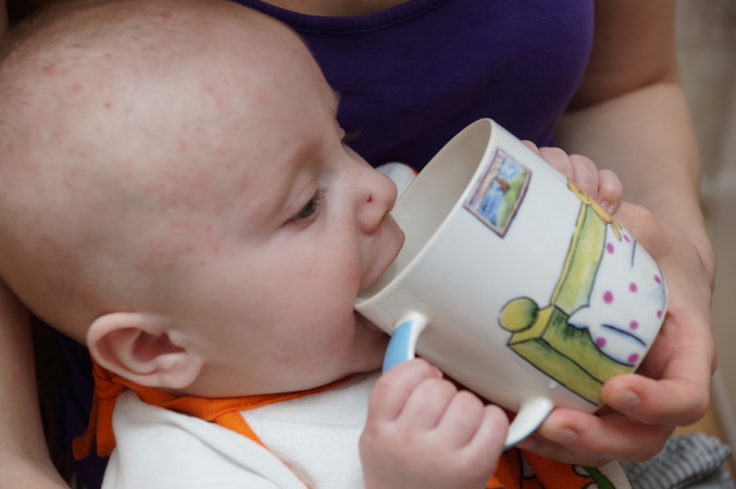 вы уже из чашки пьете???? или из поильника???? блин может и мою приучить????а не захлебывается?