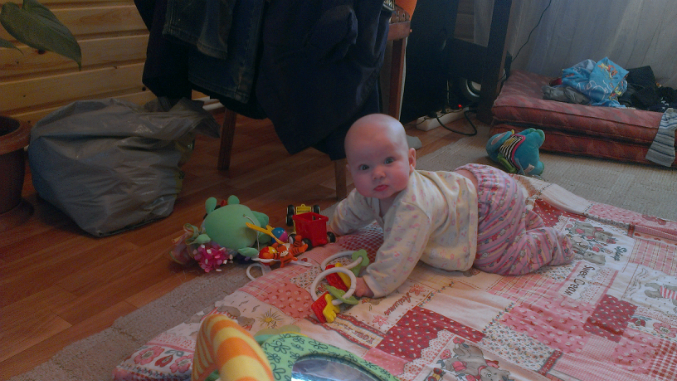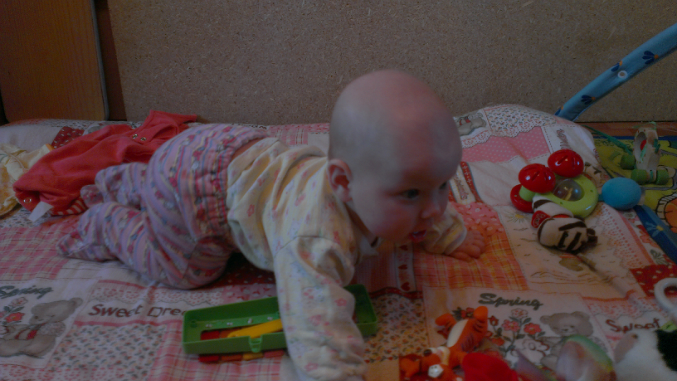 Червячком мы ползаем уже давно. На животе лежать любит. Вот на четвереньки никак. То на руках поднимится, то на коленки встанет.