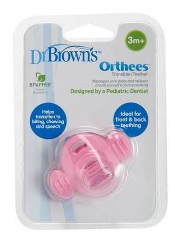 5! Приняла решение найти вариант небольшого размера, достойной фирмы-производителя, без лишних деталей, а самое главное ортодонический-разработанный профессиональными ортодонтами! И вот в ближайшем магазине я купила такое чудо:Dr.BROWNS Прорезыватель Orthees переходный!Сосками с рождения не пользовались, поэтому раньше при покупке прорезывателей я не обращала внимание на такой вариант! Это наше спасение
